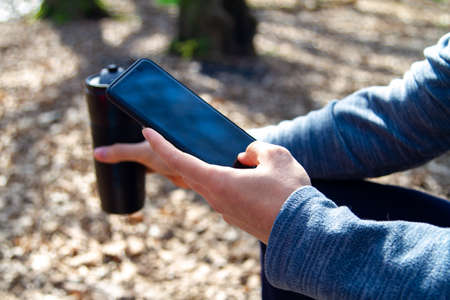 Defocus woman uses phone with a blank screen on a green meadow. Ecology concept. Digitization. Nature and digital. Out of focus.