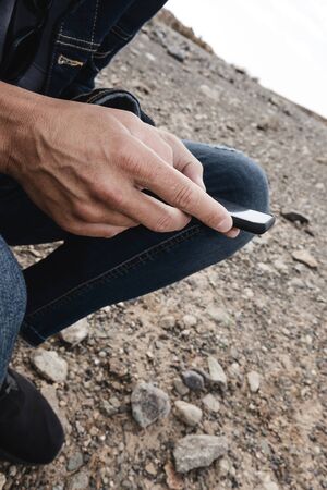 Closeup of a young caucasian man, wearing denim pants and a denim jacket, using his smartphone sitting on the ground in a desert natural landscape in autumn