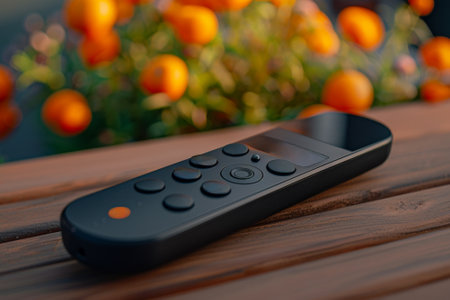 Modern remote control with plastic body and buttons, blurred background. AI generated.