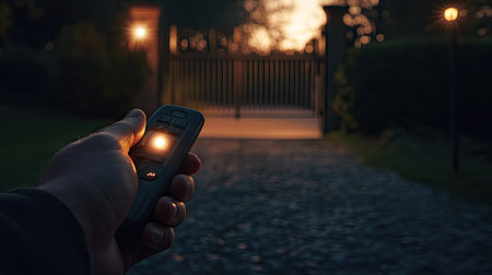 A homeowner's hand holding a remote control with a button illuminated as the gate opens in the background