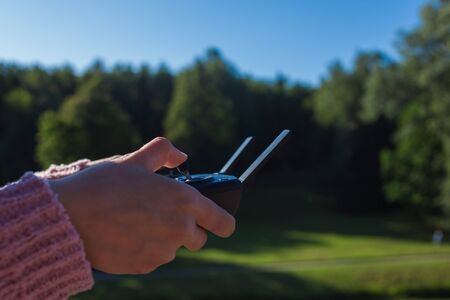 Quadcopter control, joystick in the hands of a photographer and videographer, aerial photography. high quality photo