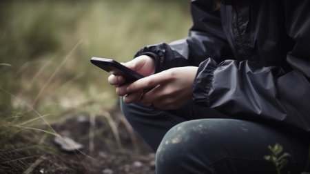 Texting with phone outdoors. Generative AI