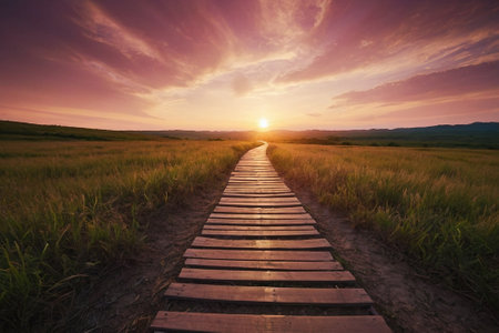 Wooden plank walkway leading to beautiful sunset in the field.