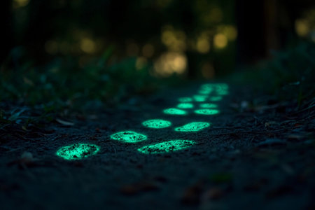 A curious cat gazes at glowing tracks on a forest path under the night sky, adding a sense of wonder and mystery to the enchanting atmosphere of the woods