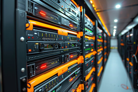 Sleek server racks with glowing LEDs showcase advanced technology and organization in a modern data center.