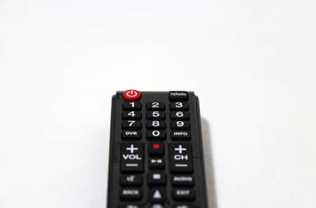 Black remote control isolated on white background. For control of a machine or apparatus from a distance by means of signals transmitted from a radio or electronic device.
