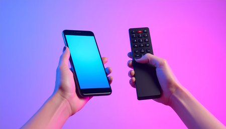 Hand holding smartphone and the TV remote to watch movies on a relaxing day in the house.