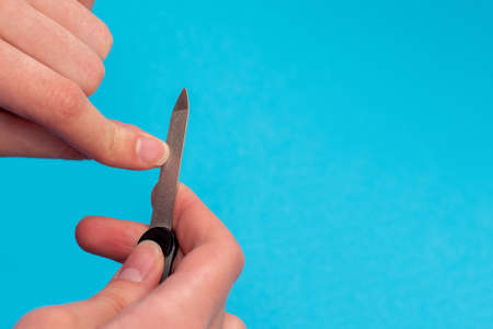 Female hand with blue nail design. Female hand with blue nail polish manicure hold nail clippers. copy space.