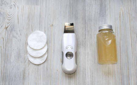 Flatlay view cleansing cosmetics products for face and body on wooden background. Set of ultrasonic scrubber, cotton disks and serum bottle.