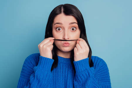 Portrait of brown-haired gorgeous nice young lady grimacing with fake mustache over blue color background