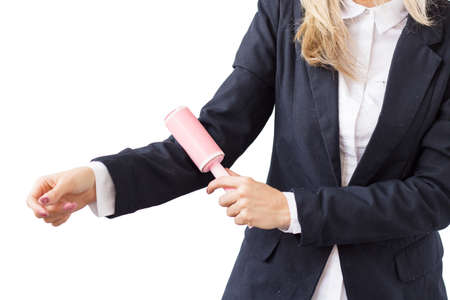 Woman cleans clothes with clothes roller, lint roller or sticky roller. Cleaning pets hair on the clothes.