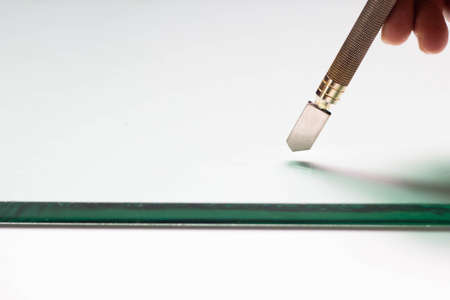 Glass technicians are cutting glass using glass tools according to the customer's order.