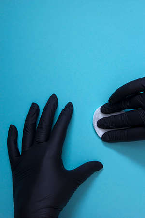 Hands in black nitrile gloves with a cotton sponge on a blue background