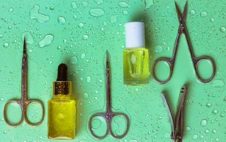 Manicure and pedicure items set on green background with water drops. Manicure scissors, tweezers, cutters, cuticle oil, nail growth oil. beauty shop products. Nail care cosmetic tools. spa treatments.
