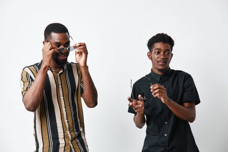 Two young black men with dark skin posing with sunglasses on white background. Casual style, confident expressions, and modern fashion with striped and black shirts.