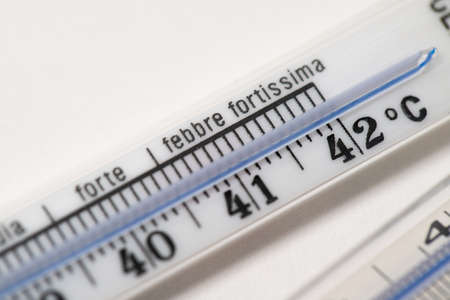 Clinical thermometer in analog form. Mercury thermometer on white background with italian writing. High fever. Fourty two degrees of fever