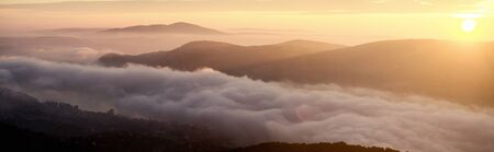 Panoramic of the Sierra de Avila, Skyline with fog at sunrise. Pico Cueva Valiente in Segovia and Madrid.