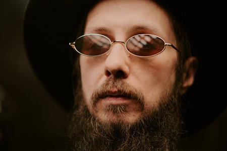 front view of a portrait of a bearded man and eyeglasses. male with closed eyes and yellow hat