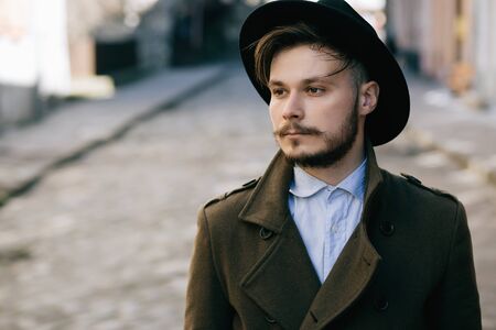 Portrait of a young man in a coat and hat on a city street