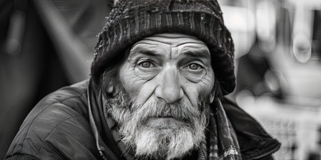 Portrait of an old homeless man on the street. Black and white.