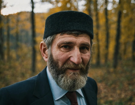 In a serene forest adorned with golden autumn leaves, a distinguished Chechen man poses confidently, embodying the strength and resilience of his culture.
