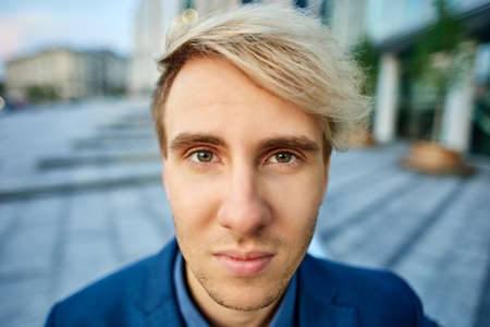 Young blonde man with serious look close up outside.