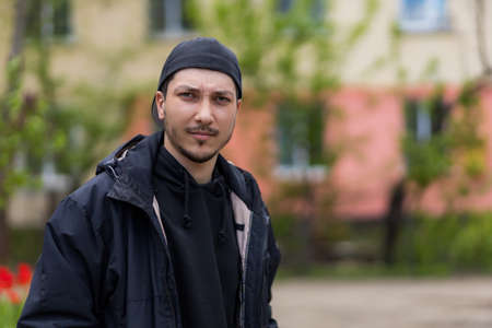 beautiful dark-haired guy portrait in gloomy day. High quality photo