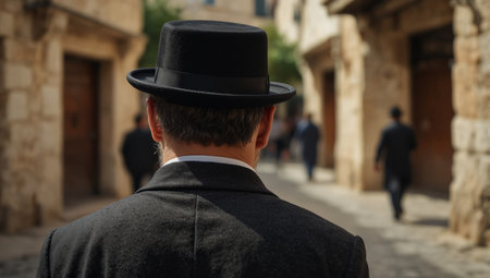 AI Generated. Rear view of a Jewish man wearing a top hat in the streets of Jerusalem