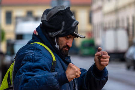Timisoara, Romania - November 29, 2021: Homeless man posing in the street. Real people.