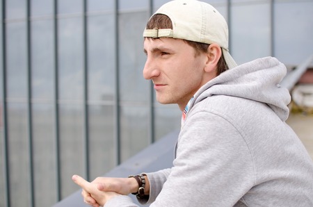 Young man is resting on the roof of the building