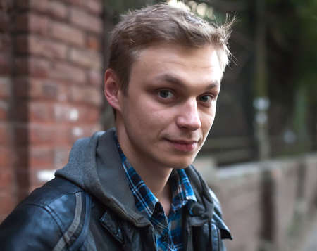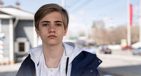 Portrait of a teenager. Teenage boy in blue jacket and white t-shirt