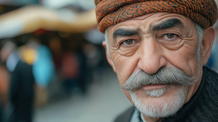 A middle-aged man stands in a lively marketplace, his thick mustache and expressive eyes highlighted by a traditional fez. The blurred background adds to the atmosphere of local culture and commerce.