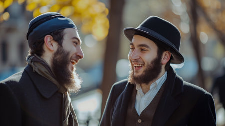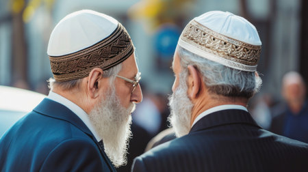 Back side Two Jewish male wearing skull cap and talking