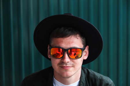 Closeup portrait of gen X Caucasian man with beard on face wearing hat and stylish sunglasses