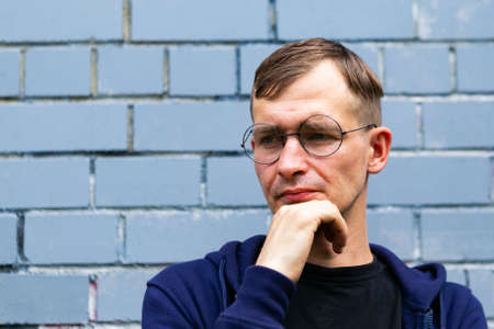 Street portrait of a handsome hipster guy with vintage sunglasses and a trendy blue sweatshirt standing on the street near a wall