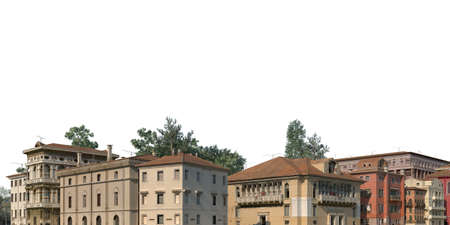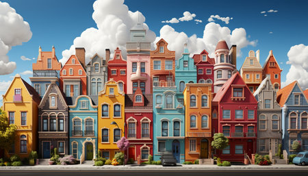 A row of colorful townhouses in a charming European neighborhood. Space for text in the sky