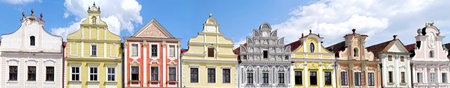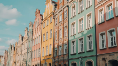 Charming pastel facades of traditional European buildings create a vibrant street scene in the town square, showcasing unique architectural details and historical significance.