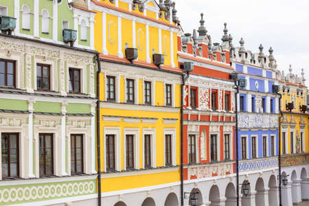 Poznan, Poland. July 11, 2021. Very colourful houses in the old market square in Poznan, Poland. The city center dates back to the 1200s. The houses are very old and charming, with vivid colours and different kinds of patterns painted on top of the colour