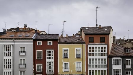 Row of colorful half timbered buildings with gabled roofs in old town of Gdansk, Poland. Living house facade with balconies. Apartment building. Mortgage in real estate