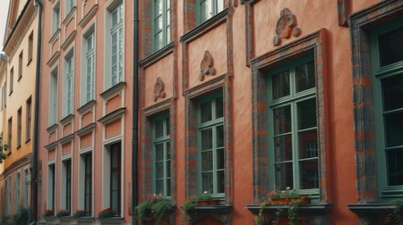 Explore the vibrant colors and unique architectural details of historic buildings in this charming European street. A floral display enhances the picturesque view.