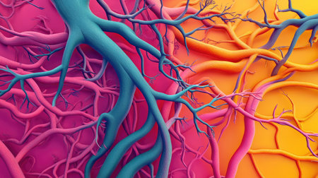 This vibrant 3D rendering showcases a human kidney with intricate vascular structures, ideal for educational and medical use. The creative design highlights the organ's anatomy and surrounding features in a visually appealing format.