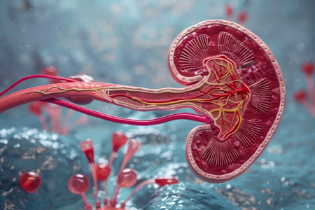 Detailed illustration of human kidneys and vascular structures, showcasing anatomy and functionality. Ideal for educational and medical purposes.