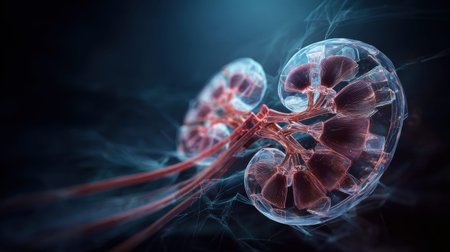 Human kidneys represented in a digital style. The kidneys are highlighted with detailed structures and connections focusing on biological functions.