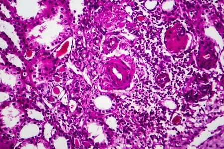 Histopathology of interstitial nephritis, light micrograph, photo under microscope. High magnification