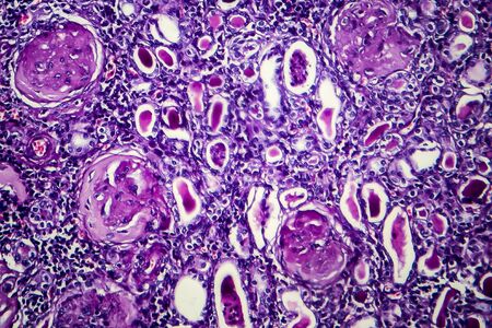 Diffuse proliferative glomerulonephritis, light micrograph, photo under microscope. High magnification