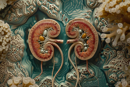 Detailed Illustration of Human Kidneys with Vivid Colors and Intricate Biological Anatomy for Medical and Educational Purposes