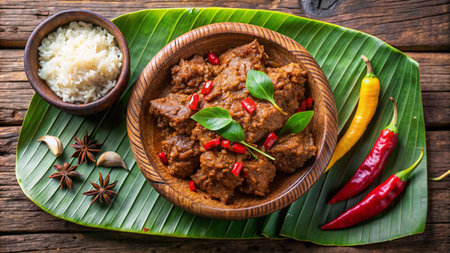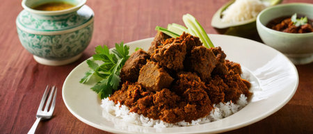 Rendang with Aromatic Spices and White Rice served on a plate