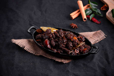 Beef roast or pothu ulartheyadu, kerala special dish arranged in an black table ware and in banana leaf in traditional way placed on a black colour background.