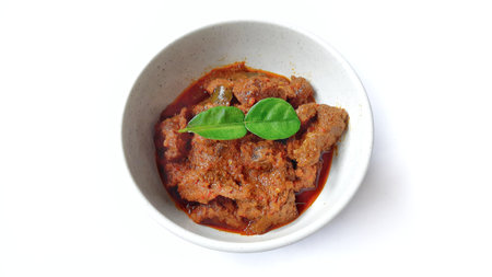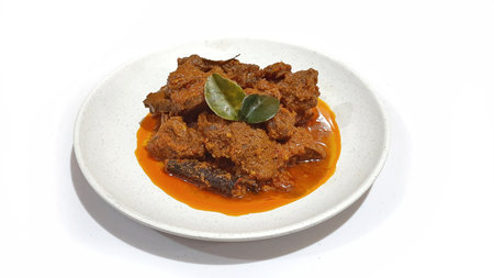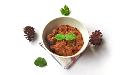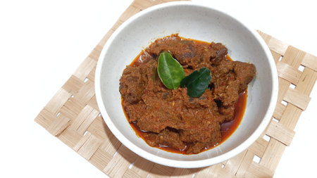 The Beef Rendang, a popular traditional Malay dish on white plate over white