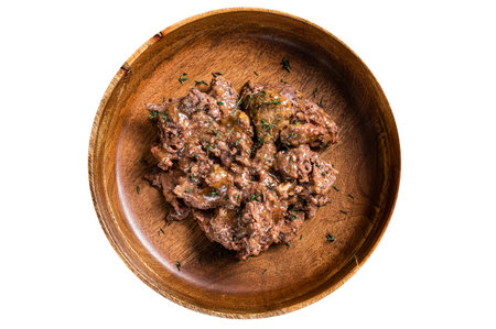 Stewed beef meat in a wooden plate. Isolated, white background. Top view